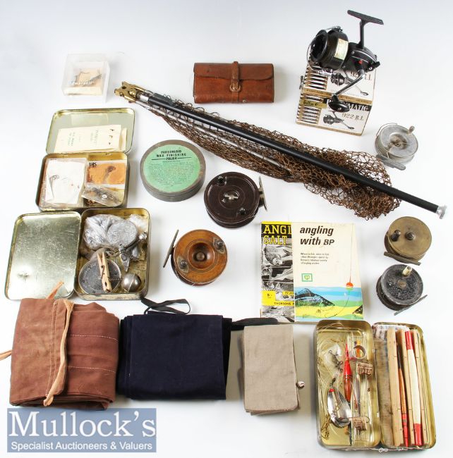 Interesting box of various fishing accessories, reels booklets, rod bags, et al - notably fine Turnbull & Co, 60 Princes Street Edinburgh leather pig skin fly and cast wallet c/w the original strap with a small collection of casts and 10 small trout flies some to gut (G); together with 3.5” Nottingham wooden and brass star back reel, 3” brass plate wind reel, plus 2 others; a packet of M C Thorburn Fishing Tackle Makers Edinburgh fly casts;, selection of ceramic line guides:2x paperback books from the 1960s including “Angling with The BP” and John Bickerdyke ‘Angling in Salt Water”; good Roddymatic 922-RL fixed spool reel in makers original box c/w line appears hardly used - good alloy and brass folding collapsible landing net, tins of tackle incl floats, rod rings, pike bung et al and various other items