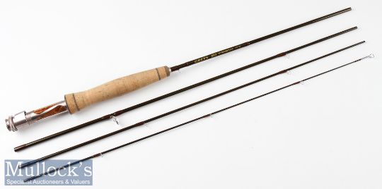 Fine as new Greys Alnwick XF2 Streamflex carbon brook travel fly rod – 6ft 6in 4pc line 4# - with anodised screw locking reel fittings with figured wooden spacer – very clean cork handle – in makers matching fitted cordura rod tube with rod details to lid