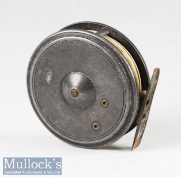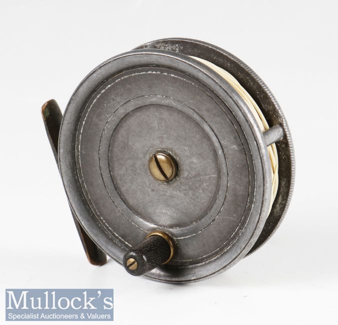 Scarce W H Dingley Maker Alnwick stamped alloy fly reel 3. 3/8” dia, constant check, smooth brass foot c/w line, rarely seen makers bordered oval logo - runs smoothly