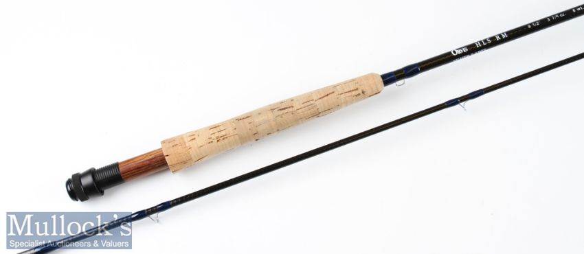 Fine and as new Orvis HLS RM (Rocky Mountain) Silver Label carbon trout fly rod – 9ft 6in 2pc line 6# wt 3 7/8oz - Fuji style lined butt guide-very lightly shop soiled cork handle fitted with screw locking reel fittings with wooden spacer-comes in makers green cloth bag complete with original makers matching green cordura rod tube with rod details to screw top