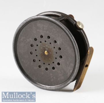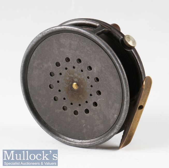 Hardy Bros Made in England The Perfect alloy sea trout/ salmon fly reel c1940s – 3 7/8” dia, ribbed brass foot, constant check, retaining some of the original lead finish - runs smoothly