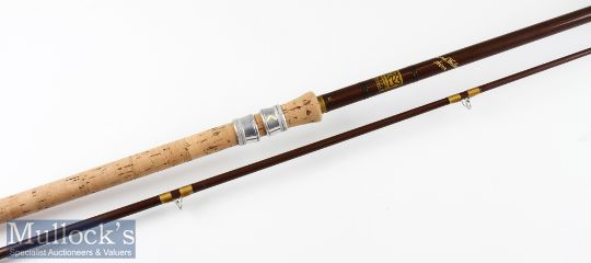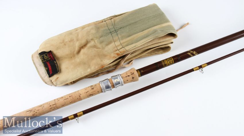 Hardy Bros Made in England “Richard Walker Avon” Fibalite rod – 10ft 2pc with amber agate lined butt and tip guides- 27.5 inch trumpet style cork handle with alloy sliding reel fittings (very clean) -comes in the House of Hardy “Gordons” cloth bag