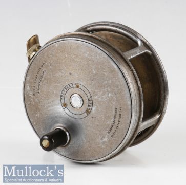Hardy Bros Alnwick The Perfect 3 ¾” alloy fly reel Dup Mk II wide drum with smooth brass foot, rim tensioner, appears to run smooth, minor line wear