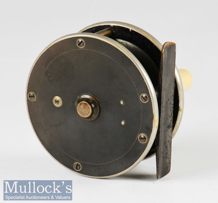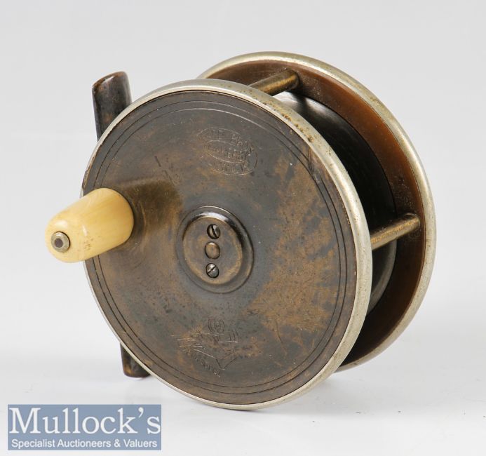 Early Hardy Bros Alnwick brass, ebonite and nickel plated rim fly reel – 3” dia stamped with makers Rod in Hand and bordered oval logos – constant check, runs smoothly – retaining much of the original bronzed lacquered finish – good ebonite back plate