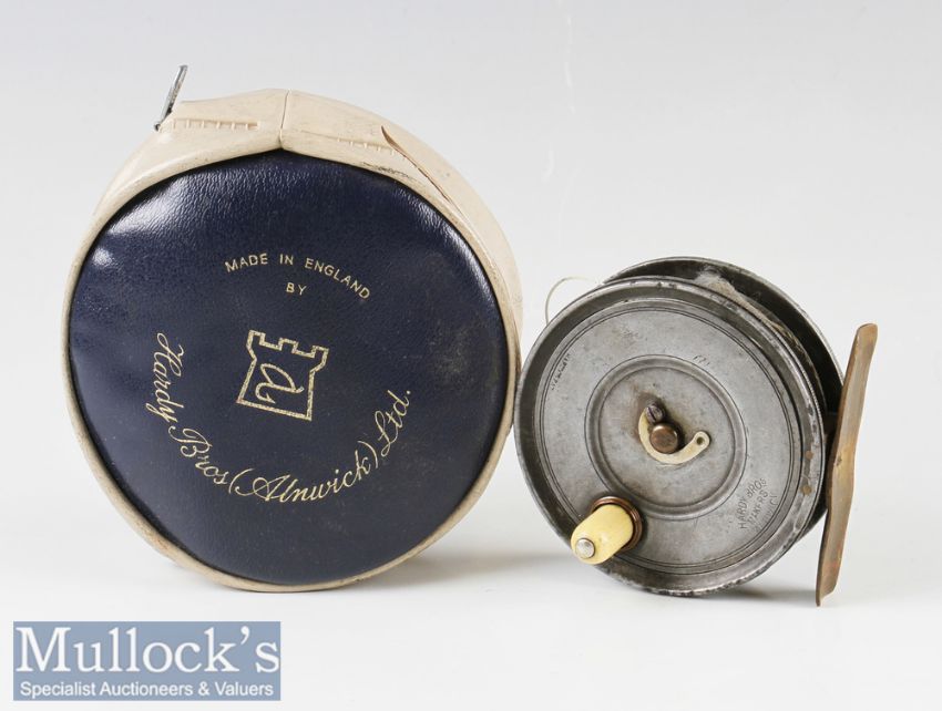 Hardy Bros Alnwick Early check Uniqua 3 1/8” alloy fly reel with Hardy’s oval logo, marked Hardy Pat to face, appears with replaced brass foot, some damage to rim in places, cracked white handle, check requires TLC, with makers zipped case