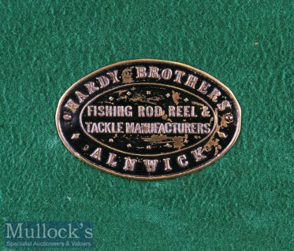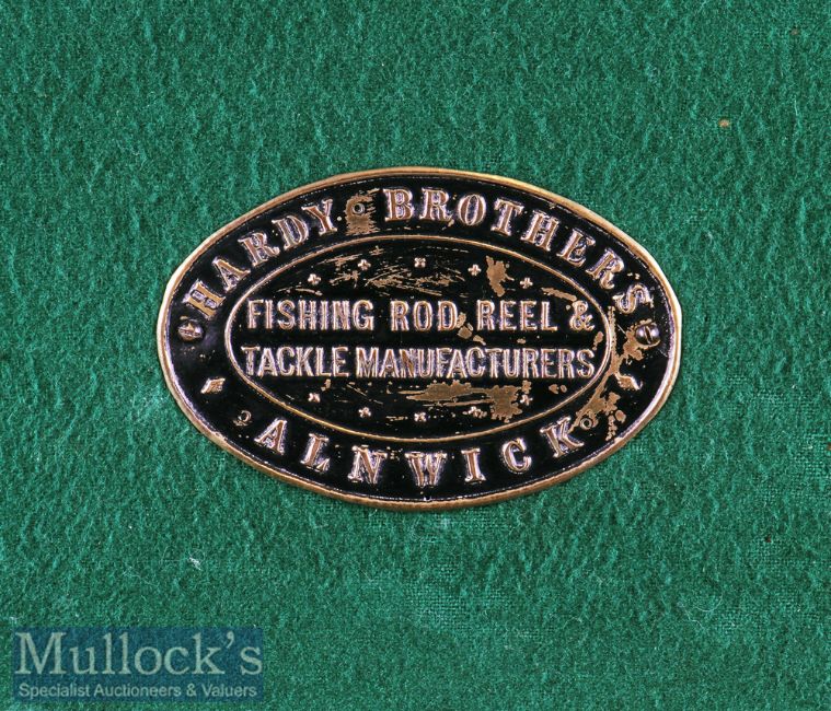 Rare and not seen before, Hardy Bros Alnwick large leather and brass cornered travelling case c/w leather straps. Leather carrying handle and brass lock – opens to reveal a rare makers brass and black oval plaque 2.5”x 3.5” inscribed Hardy Bros Alnwick - Fishing Rod, Reel and Tackle Manufacturers – green baized lining divided into 5x various reel/accessories compartments measuring 7”x 5.25”, 6.5”x 5.25”, 5.75” x 5.25”, 4.5” x 5.25” and 3.25” x 5.25” – either side of centre compartment 34” x 5.25” – plus rod section along the whole length - overall 66.5”x 9.5”x 4.25” – note lid has had the owners name removed and replaced matching leather insert.