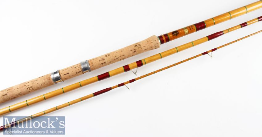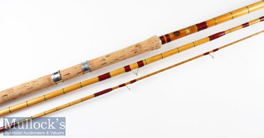 Fine A E Rudge & Son Redditch “Float Fisher” Spanish Reed/Split Cane rod fully refurbished – 12ft 3pc with whole cane butt and mid-section with spliced whole cane/ split cane tip – grey agate lined butt and tip guides – c/w makers Spanish Reed “Handle with Care” label just above the good makers circular decal label (retaining most of the black border otherwise complete) – professionally refurbished to a high standard – comes in cloth bag