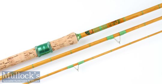 Fine Mitre-Hardy “The Wondrex Super Float” split cane rod fully refurbished – 11ft 3pc with amber agate lined butt and tip guides – with matching green anodised reel fittings, butt cap and whippings– retaining nearly 99% makers detailed label just above the 21” trumpet style cork handle – and comes in makers cloth bag (shrunk)