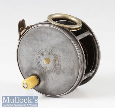 Early Hardy Bros Alnwick Perfect 3 ¾” alloy wide drum salmon fly reel with revolving nickel silver line guide (fused/not revolving), cracks to faceplate rim at line guide, smooth brass foot, white handle with minimal movement, strap rim tensioner, c1912 check mechanism, together with Hardy Bros D block leather case with replaced leather strap (2)