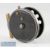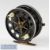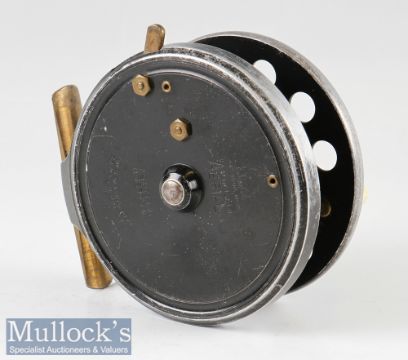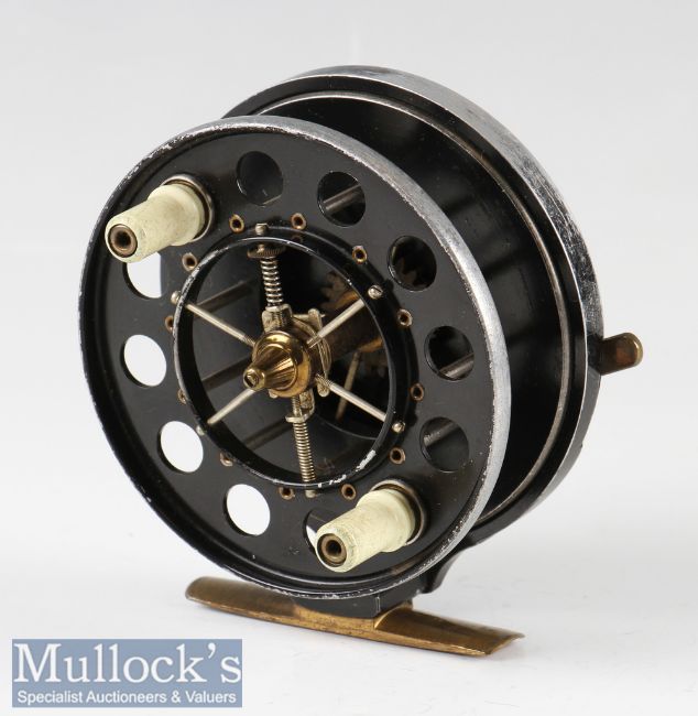 Scarce Allcocks Aerial Alloy Ventilated Centre pin reel with rim check lever c1930 early 1940s – Mode with l no 7950T10 – 3.5” dia black finish with 10x ventilations - stamped with makers stag logo, makers details and pat nos – correct brass foot and original handles – plus the rare makers retail box with original labels to the top and bottom of the box.
