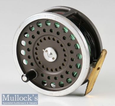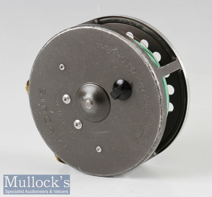 Hardy Marquis Salmon No 2 alloy fly reel with spare spool (2) - brass ribbed foot, usual paint wear to the back plate rim both come with line and contrasting spools and lines – used – runs well c/w makers black padded case (labels read Aircel Supreme DT11F and Arrowhead T9/11F)