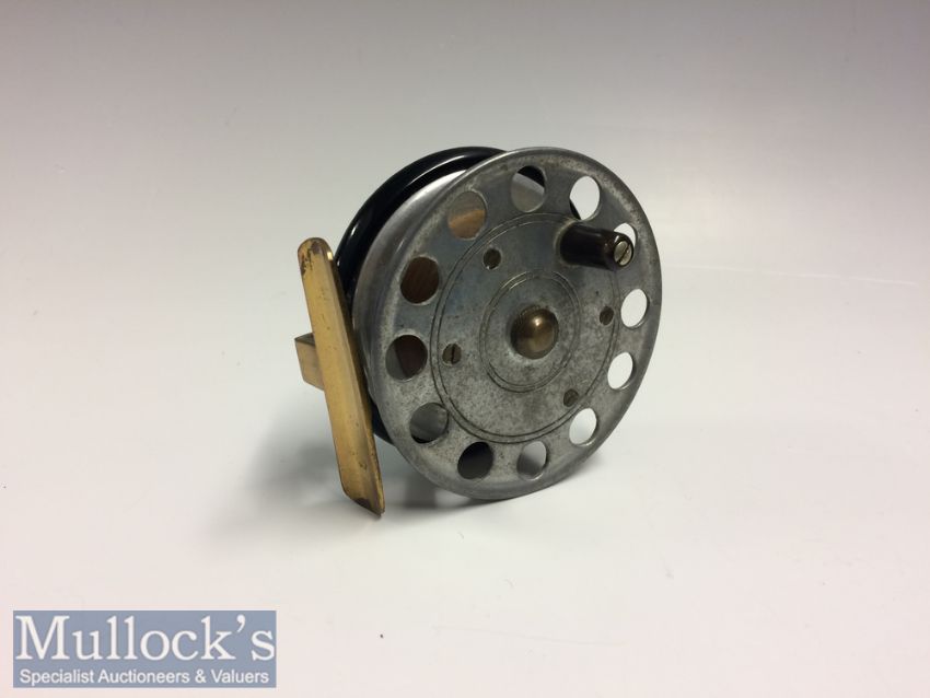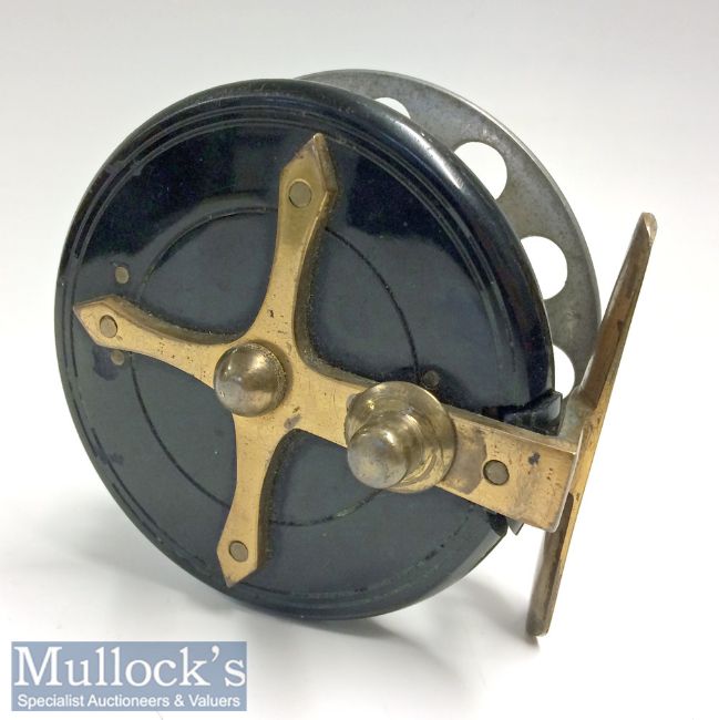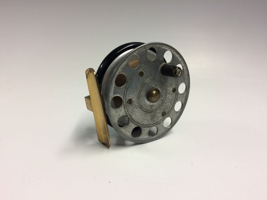 Scarce Crossle Patent 3” alloy, wood, ebonite and brass reel with a brass star back, perforated alloy face, crack to ebonite back plate just under the brass reel seat and comes with a leather fitted case
