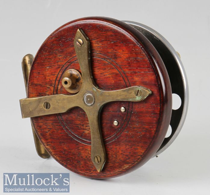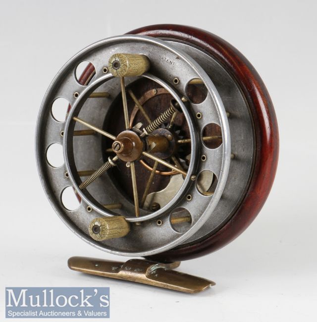 Allcock Improved Coxon Aerial 3 ¾” centrepin reel with brass lined mahogany back plate, calliper check, aluminium spoked drum stamped ‘Patent’ to front flange, twin xylonite, brass star back, all original, appears in good condition overall
