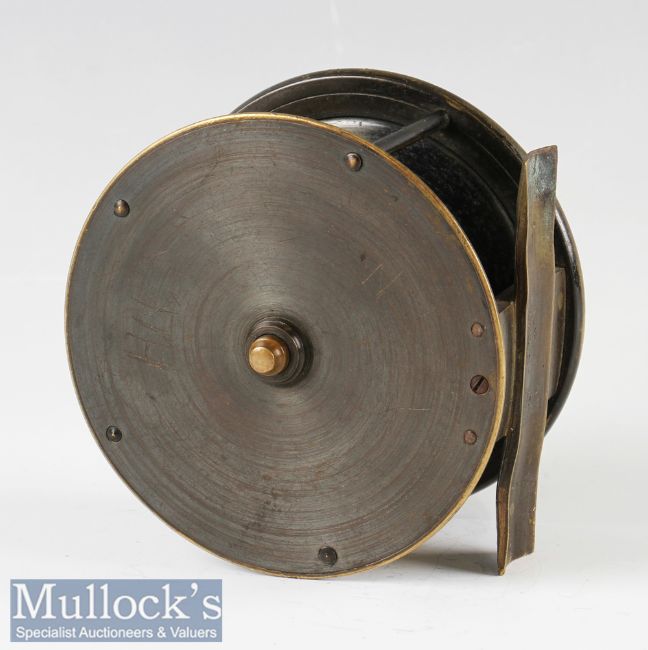 G Little & Co Makers to HRH Prince of Wales’ London brass plate wind salmon fly reel c1890s - 4” dia four pillar construction, some initials scratched to each side, winds smoothly