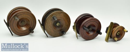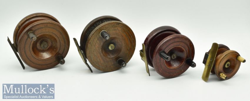 Collection of various Nottingham wooden and brass/metal strap back reels (4) – sizes incl 3.5” with brass strap back; 3.5” with metal strap back fitted with brass foot (bent); Allcocks 3” with brass strap back stamped with makers oval details; and 2” with wide metal strap back c/w brass foot – all in good condition