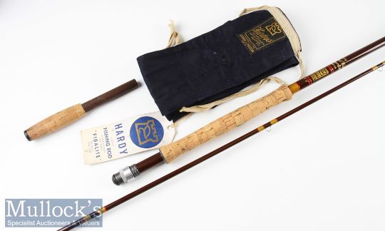 Good Hardy’s Made in England “Richard Walker Superlite” trout fly Rod – 9ft 3in 2pc line 7/8# - clean trumpet style cork handle fitted with makers alloy screw locking reel fitting with matching Fibalite spacer – lightly used and comes in makers cloth bag c/w original Hardy Retail labels