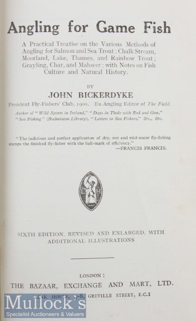 Bickerdyke, John - “Angling for Game Fish” 6th ed revised and enlarged with additional illustrations in the original pictorial wrappers - various plates of rods, flies fish etc, and other illustrations together with various advertisements to include J Peek & Sons London, Allcocks et al – tiny nick to one corner otherwise (G)