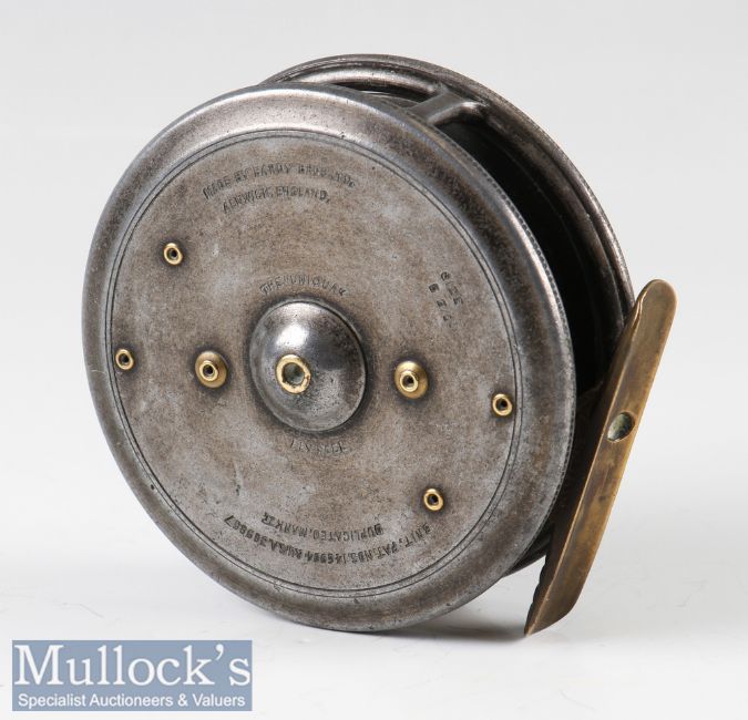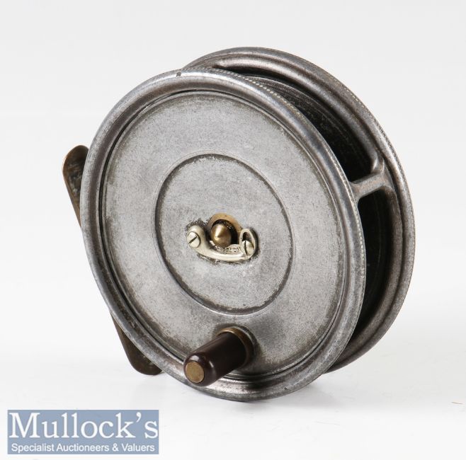 Hardy Bros Alnwick Uniqua Dup Mk. II alloy fly reel – 3 3/8” dia – ribbed brass foot – stamped WS to inside back plate – turns smoothly