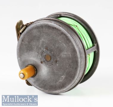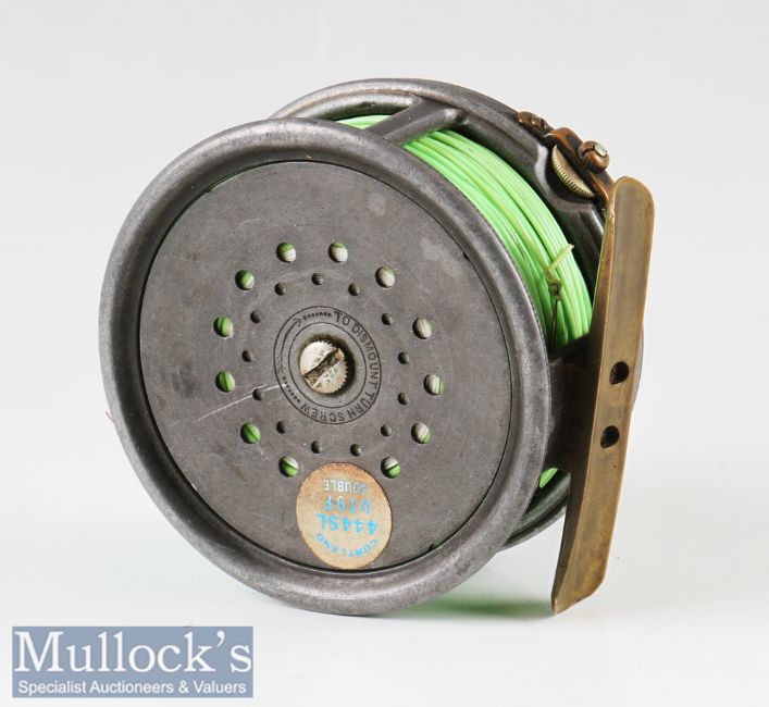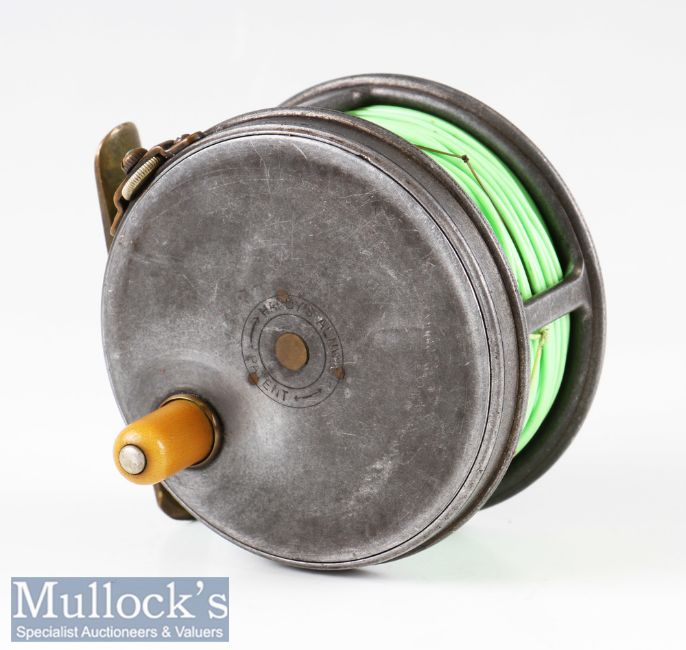 Early Hardy Bros Alnwick 1912 Check The Perfect Pat 1912 Check 4” alloy salmon fly reel – original smooth brass foot very lightly filed to both ends and slight knock to one end, turks head locking screw over brass bridge rim tension regulator, fitted with heavy duty “New Patent Compensating Check” and stamped AB in a circle to the inside plate wind and 5P – runs smoothly – some line cuts to main frame just below the brass foot
