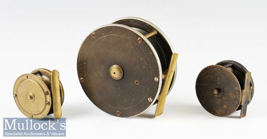 3x various brass/ebonite/nickel silver and brass reels – Carter & Co London “SEJ” style brass, ebonite and nickel silver 4.5” salmon reel - no check – brass plate wind slightly high in places, turns smoothly: Allcocks 2.25” brass plate wind (constant check – stiff) an another similar style constant check (G)