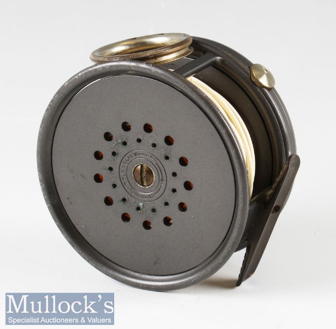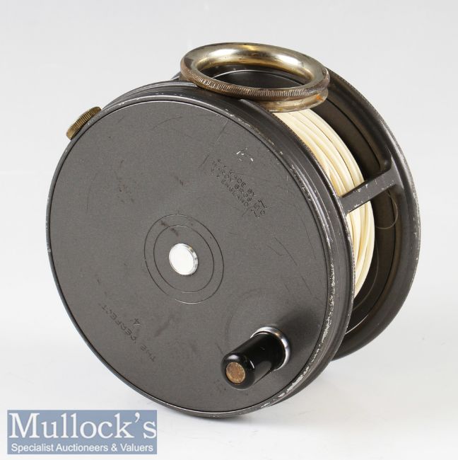 Good Hardy Bros England The Perfect 4” alloy salmon fly reel – bronzed alloy ribbed foot, nickel plated revolving line guide, some light rim paint wear – c/w line (label reads Arrowhead F) – very lightly used – runs well and comes in makers padded case.