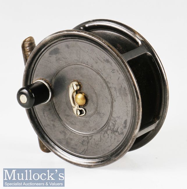Fine Hardy Bros Makers Alnwick The Uniqua Dup Mk II alloy wide drum salmon fly reel c1920/30s – 4” dia. ribbed brass foot, ebonite handle, rim screw tension regulator – retaining nearly all the original dark lead finish – comes in period unmarked box – runs smoothly and hard to fault