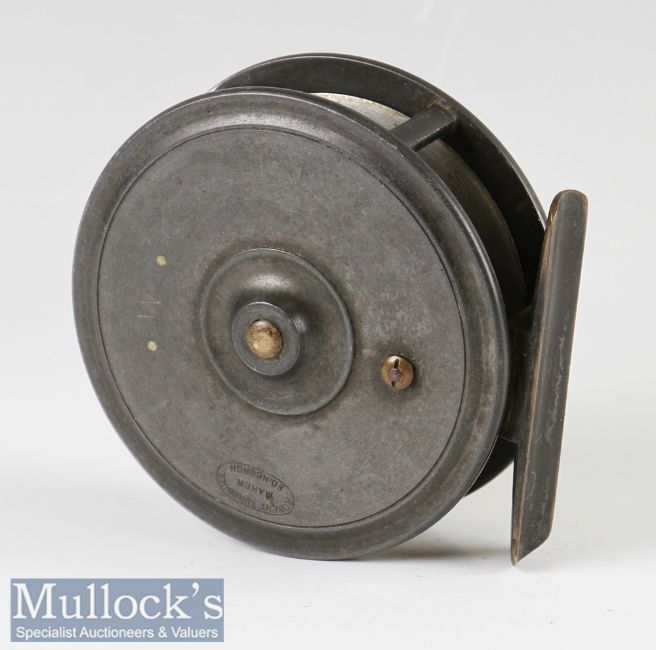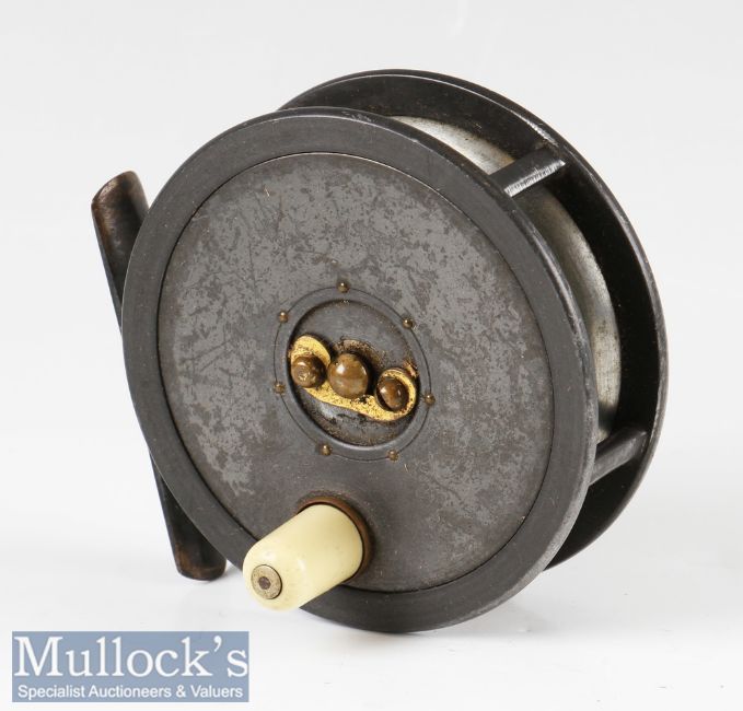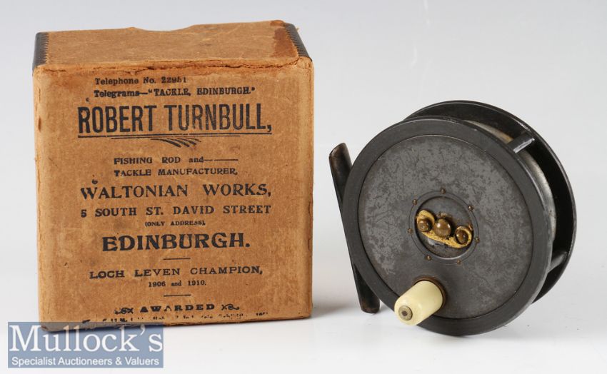 Robert Turnbull Edinburgh 3 ½” alloy trout fly reel smooth brass foot, early calliper constant check, pillared drum core with telephone style latch, ivorine handle, very good condition with maker’s box