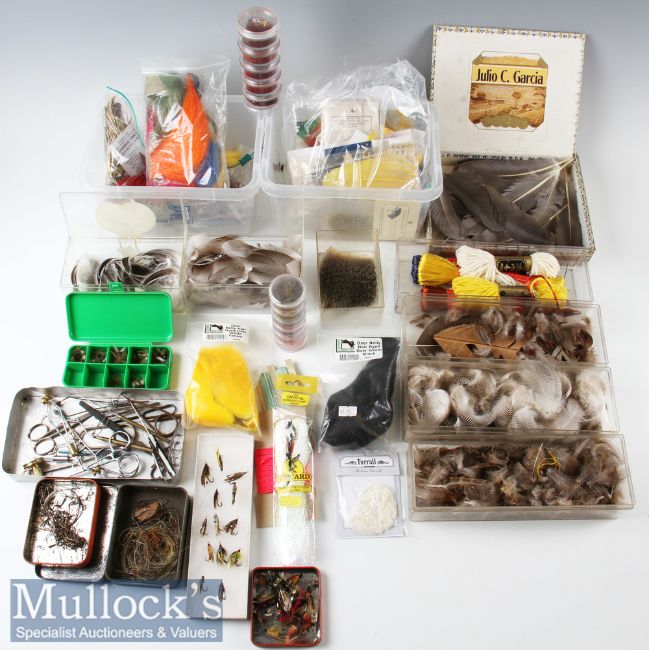 Assorted Selection of Fishing Fly Feathers and Fly Tying tools including mostly loose feathers and material^ within plastic boxes^ tobacco tins etc^ plus a small selection of tools^ scissors^ etc (Qty) Box