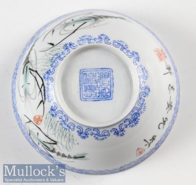 20th Century Chinese Porcelain Bird Feeder with enamelled figural design with openings to front and rear^ top A/F^ unmarked^ height 13cm^ together with a Chinese egg shell porcelain bowl with insect and character design^ with four character blue mark to base^ dia. 18.5cm. (2)
