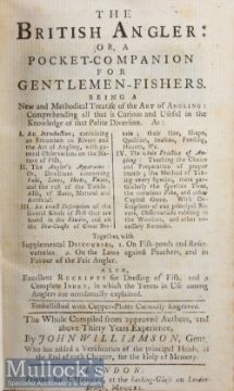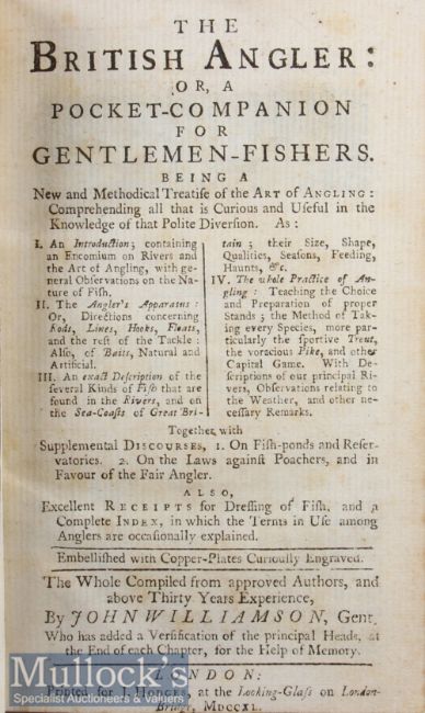 Williamson^ John – The British Angler or a Pocket Companion for Gentleman Fishers^ 1740^ printed for J Hodges. Engraved frontis plate and 3 fine engraved folding plates^ bound in early full calf^ gilt tooling on upper cover and spine.
