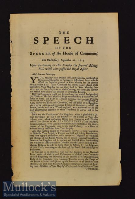 The Speech of the Speaker of the House of Commons 1715 ‘South Sea Company’ Sept 21^ upon presenting to His Majesty the Several Money Bills which then passed the Royal Assent. London^ Printed for Tonson in the Strand^ frayed to edges^ minor foxing