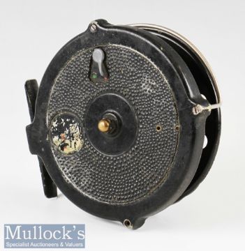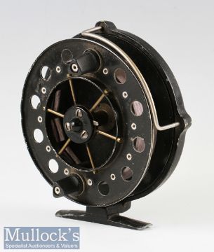 Mordex of Sheffield ‘The Merlin’ 4 ½” centrepin trotting reel with 6 spoke Aerial style drum^ quick release^ twin triangular handles and on/off check backplate^ knocks to rim of face^ wear^ o/w runs smooth