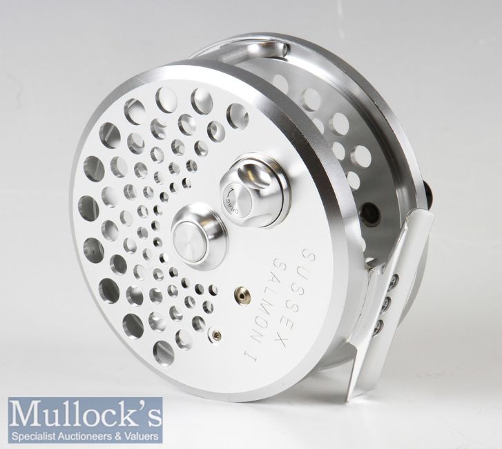 Ken Sawada Sussex Salmon I 4” Fly Reel^ ventilated reel with skeleton back^ rear drag adjust^ quick release drum^ overall signs of use^ otherwise good condition.