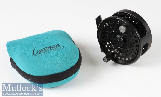 Lamson LP – 2 3 1/8” Ventilated Fly Reel black finished^ rear drag adjuster^ moves freely^ light signs of use^ with maker’s padded bag.