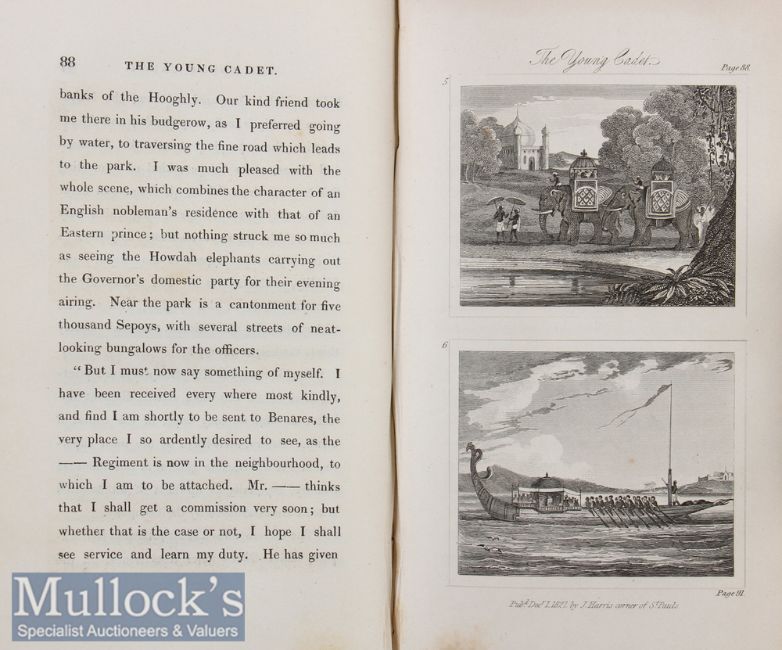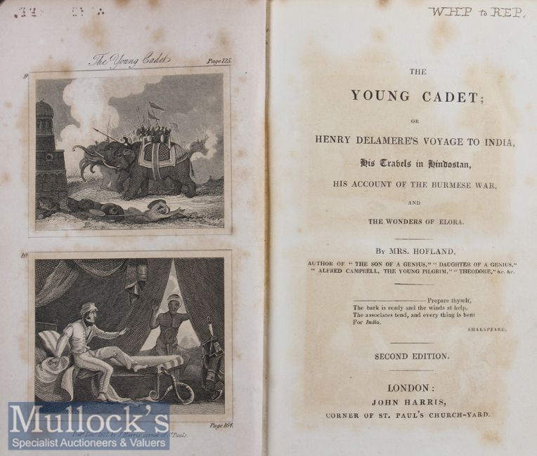 India - The Young Cadet Or Henry Delmere’s Voyage To India^ His Travels In Hindostan^ His Account Of The Burmese War by Hofland 1827 - a 232 page book with 10 illustrations giving an interesting account of his joining the East India Company’s Army^ voyaging out^ his travels across to Allahabad and Cawnpore life and people there. Also his adventures along the Irrawaddy during the Burma War. Leather spine and original board covers^ size 4½” × 7”.