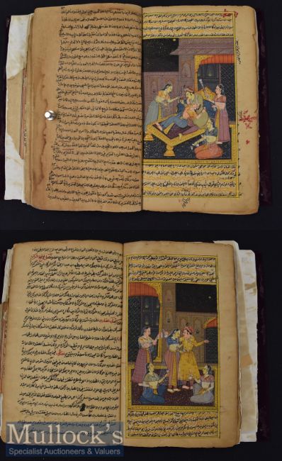 India-Persia Manuscript with Miniature Paintings - a Persian manuscript with 10x Indian Miniatures painted over the manuscript^ c19th century^ browned due to paper^ partly slightly stained and with small defects in places. Miniatures well preserved^ impressive Indian Illuminated miniature over a Persian manuscript. Various court scenes