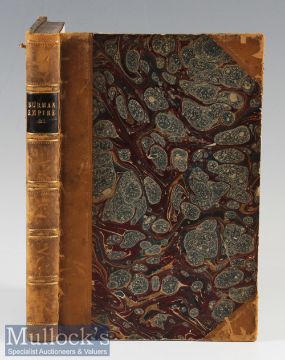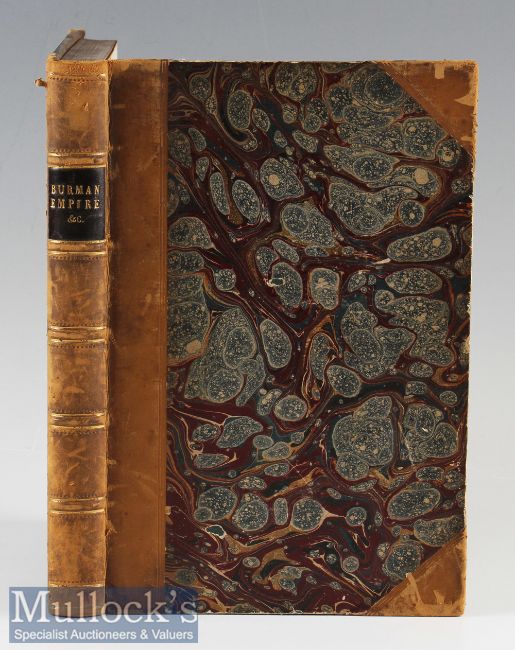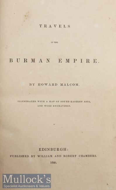 Travels In The Burman Empire (Burma) by Howard Malcom Book half leather hardback with marbled boards^ published in 1840 by William and Robert Chambers. Illustrated with a frontis map of South-Eastern Asia and wood engravings. Travels in Burmah^ Chittagong and Arracan. Has 82 pages. Also has two other bound in books. Size 6½” × 9½”.