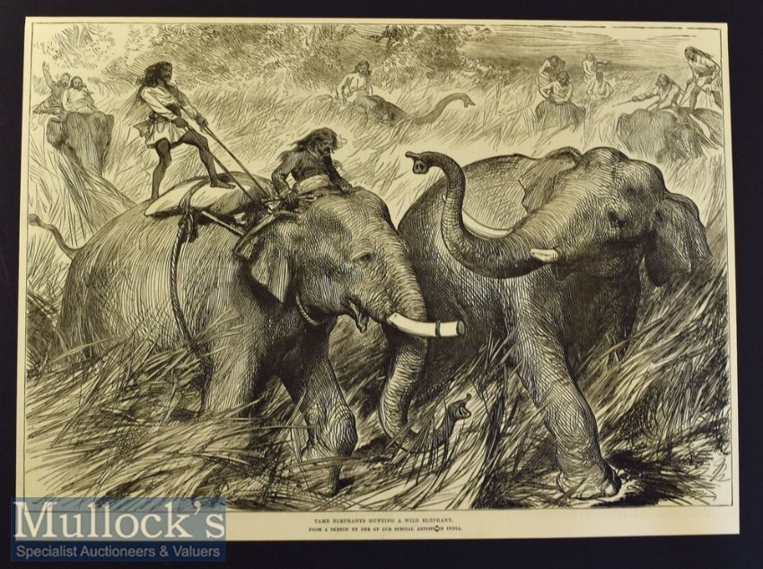 India - Nepal - Two original engravings Hunting a Wild Elephant 34x25cm and Royal Party Chased by a Wild Elephant 35x25cm both after W Simpson 1876 laid to card (2)