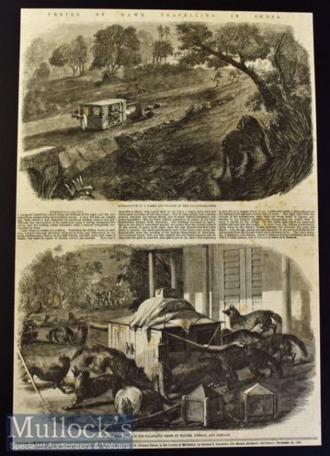 India - Perils of Dawk Travelling in India two original engravings and text 1858 'Appearance of a Tiger and Flight of the Palkee-Bearers' and 'The Traveller in his Palanquin Beset by Wolves^ Hyenas and Jackals' 36x25cm overall^ laid to card