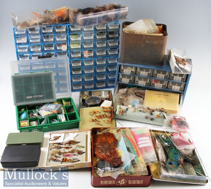 Quantity of Various Fishing Tackle Accessories to include a compartmental storage cabinet with drawers measuring 44x32x7cm^ another metal cabinet 31x15x17cm with drawers^ various feathers^ tins of feathers^ various hooks^ large quantity 2x Boxes