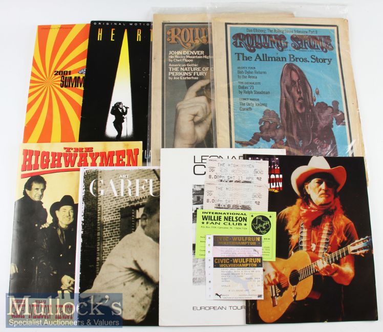 Rolling Stone Newspapers to include 8 May 1975^ 14 Feb 1974^ 6 Dec 1973^ together with The Highwaymen programme and tickets (3)^ Leonard Cohen European Tour 1988 programme^ Willie Nelson European Tour 1994 programme and tickets (4)^ Art Garfunkel Tours Brochure^ and 2001 Summer Pops brochure^ condition appears G overall (13)