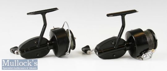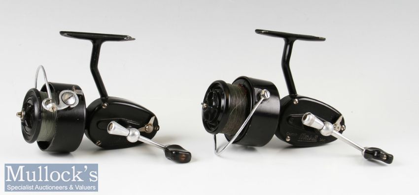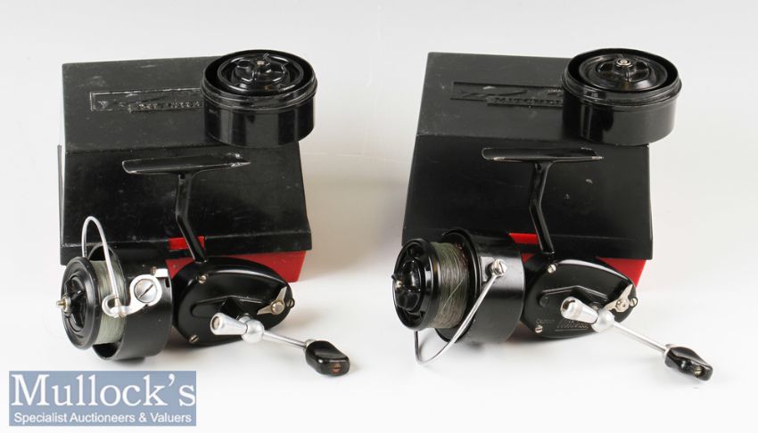Mitchell 300 Spinning Reel LHW^ full bail arms with spare spool together with Mitchell Garcia 300 spinning reel LHW full bail arm with spare spool^ both in plastic cases (fair)^ appear with light wear^ run smooth (2)