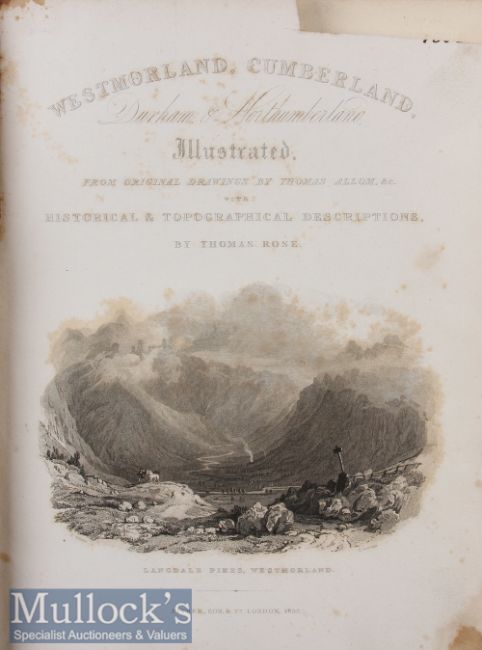 1832 Westmoreland^ Cumberland^ Durham and Northumberland Illustrated Book from original drawings by Thomas Allom^ George Pickering &c with Descriptions by T. Rose. A large 220 page book with 211 finely engraved steel plate illustrations of the lakes^ country houses^ magnificent hilly landscapes and towns etc. There is one print missing^ thus reflected in very reasonable price. In original board and leather binding^ size 9¾” × 11” and 2” thick