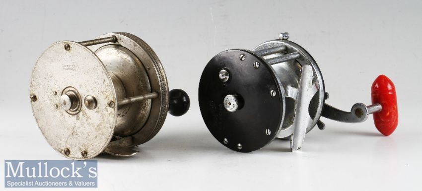 Penn Longbeach Sea Fishing multiplier Reel No 60 with counter balanced torpedo handle together with Pflueger Pontiac surf casting reel: patented No 1450738 both with signs of wear (2)
