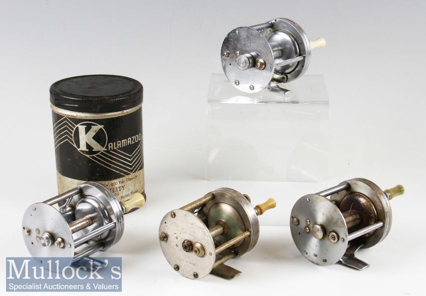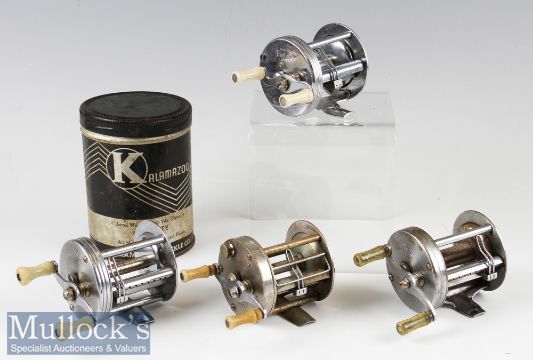 4x American Baitcasting Reels to include South Bend level wind casting reel No 1200 multiplying reel^ Bronson ‘Fleetwing’ No 2475^ a ‘Kalamazoo Pride’ 1704 in maker’s utility tin (slight sticking when wound) and a Shakespeare ‘True Blue’ 1956 Model FK – all running smooth^ light signs of wear apparent