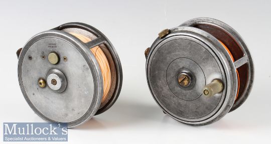 2x alloy fly reels - scarce Preedy Pat Appl’d 4.25” salmon reel with ivorine crazed button to the back plate^ brass smooth foot and stamped Pat Applied For on the back plate^ with another unnamed^ with ivorine handle (loose) with brass smooth foot and rim tensioner with check^ (small internal rivet / screw missing from mechanism)^ both well used. (2)