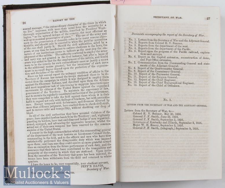Americana – Report of the Secretary of War^ Navy and the Postmaster General for the Year 1856 Book being Message from the President^ 34th Congress^ Ex Doc No.1 Vol II Washington Dec 1856^ contains reports and letters relating to the Kansas troubles^ Cheyenne troubles^ Yakima War Washington Territories etc^ also Pacific Railway Explorations^ Army organisation and dispositions^ original embossed covers^ spine split