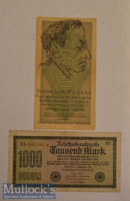 WWII Anti-Jewish Propaganda Banknotes inflation era German banknotes over-printed with Anti-Semitic slogans. These were used as propaganda tools placing the blame for hyper-inflation which ruined Germany throughout the 1920s on the Jews. ‘The gold^ the silver and bacon^ the Jew has taken from us and left us with this filth’ condition A/G (2)