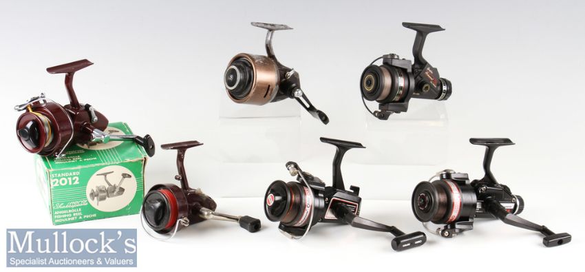 6x Shakespeare Spinning Reels including Standard 2012 with box^ Standard 2002^ Omni-X 040^ Omni 037^ Graphite and closed face Match International (very worn)^ all in used condition^ all with smooth movements. (6)