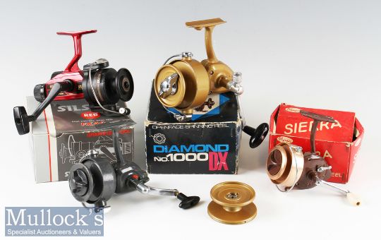 Mixed Fixed Spool Reel Selection (4) including Diamond 1000 Super Deluxe with spare spool^ Silstar FX40 and Olympic Sierra reel^ all in maker’s boxes^ all run smoothly^ with an unboxed Norris 66 reel^ has some gear slipping. (4)